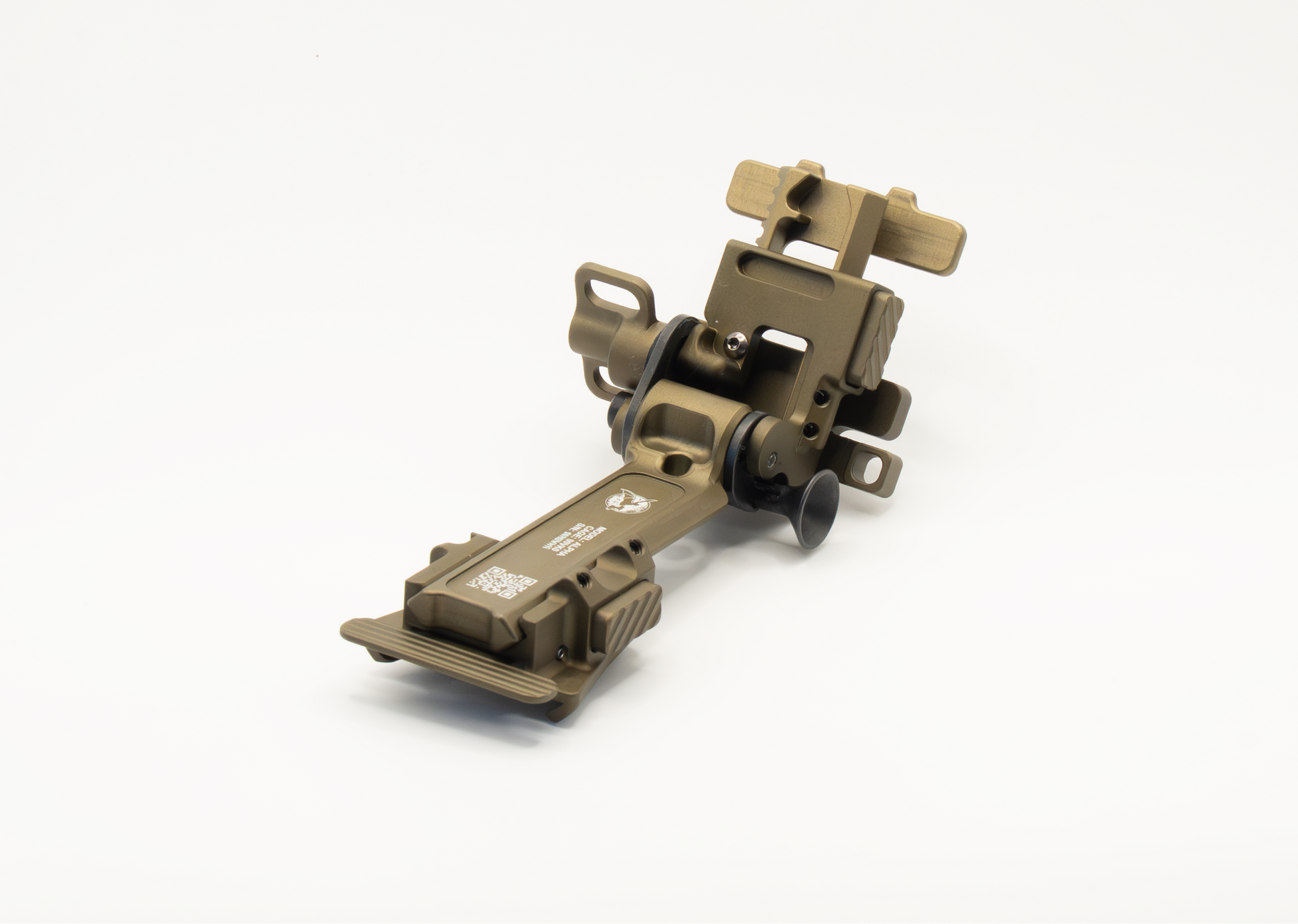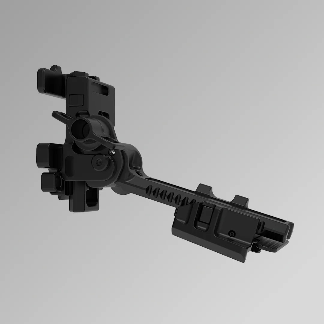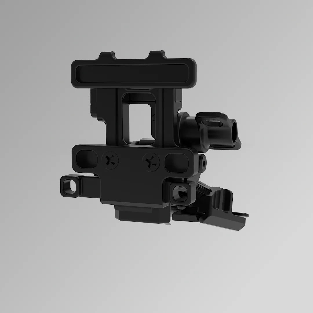 The “ALPHA” Mount is the pinnacle of night vision helmet mounts. Coming in at 80 grams, it is the lightest and lowest stowing night vision mount available to date for the common “dovetail” shoe interface. This mount is patent pending with a novel design that incorporates a ball detent force to overcome mechanism while also locking at the stowed and deployed positions. This is purposeful and is designed to defeat unwanted wobble in the mount commonly seen in other night vision mounts while also decreasing the chance of accidental deployment. Completely designed, machined, and assembled in the USA, and built to last with high strength 7075-T6 Aluminum, and 17-4 PH Stainless steel. This mount has an optional factory variant that supports a powered shoe for Nocturn Industries devices that are equipped with this option.