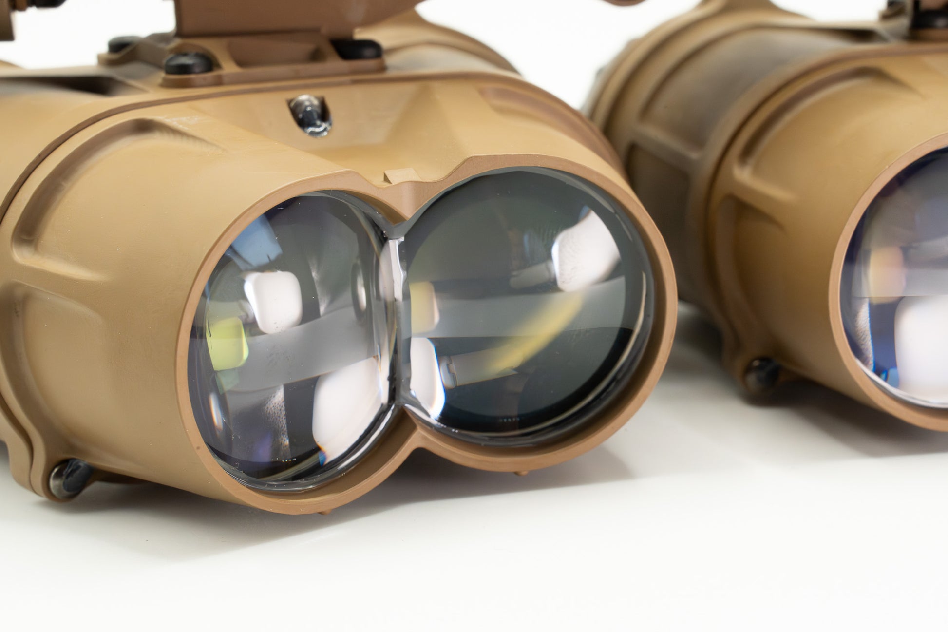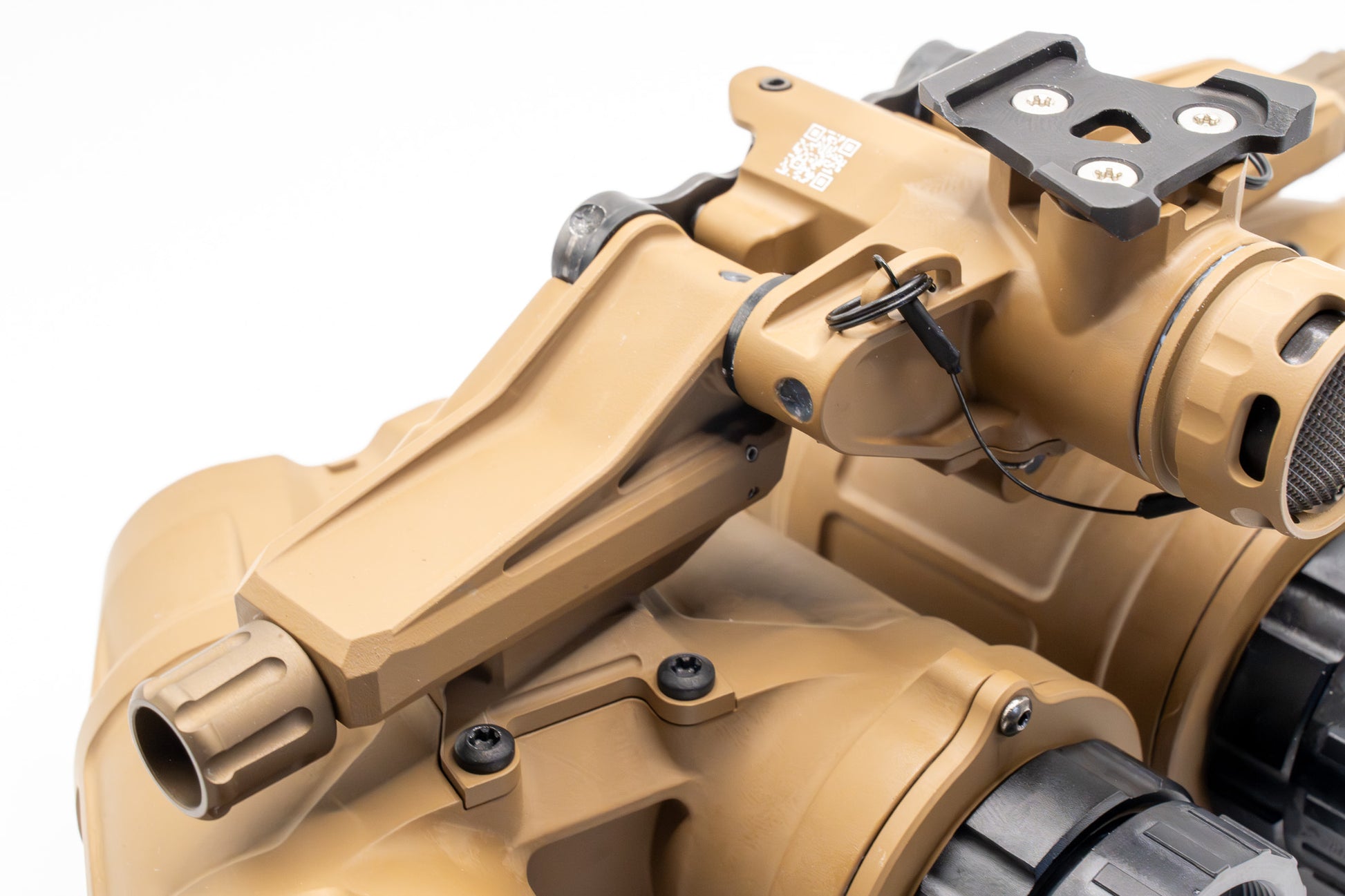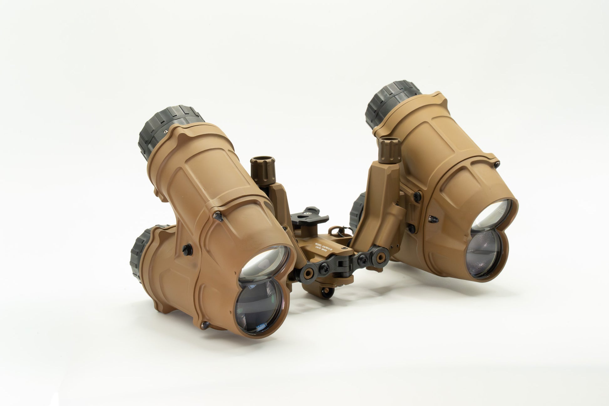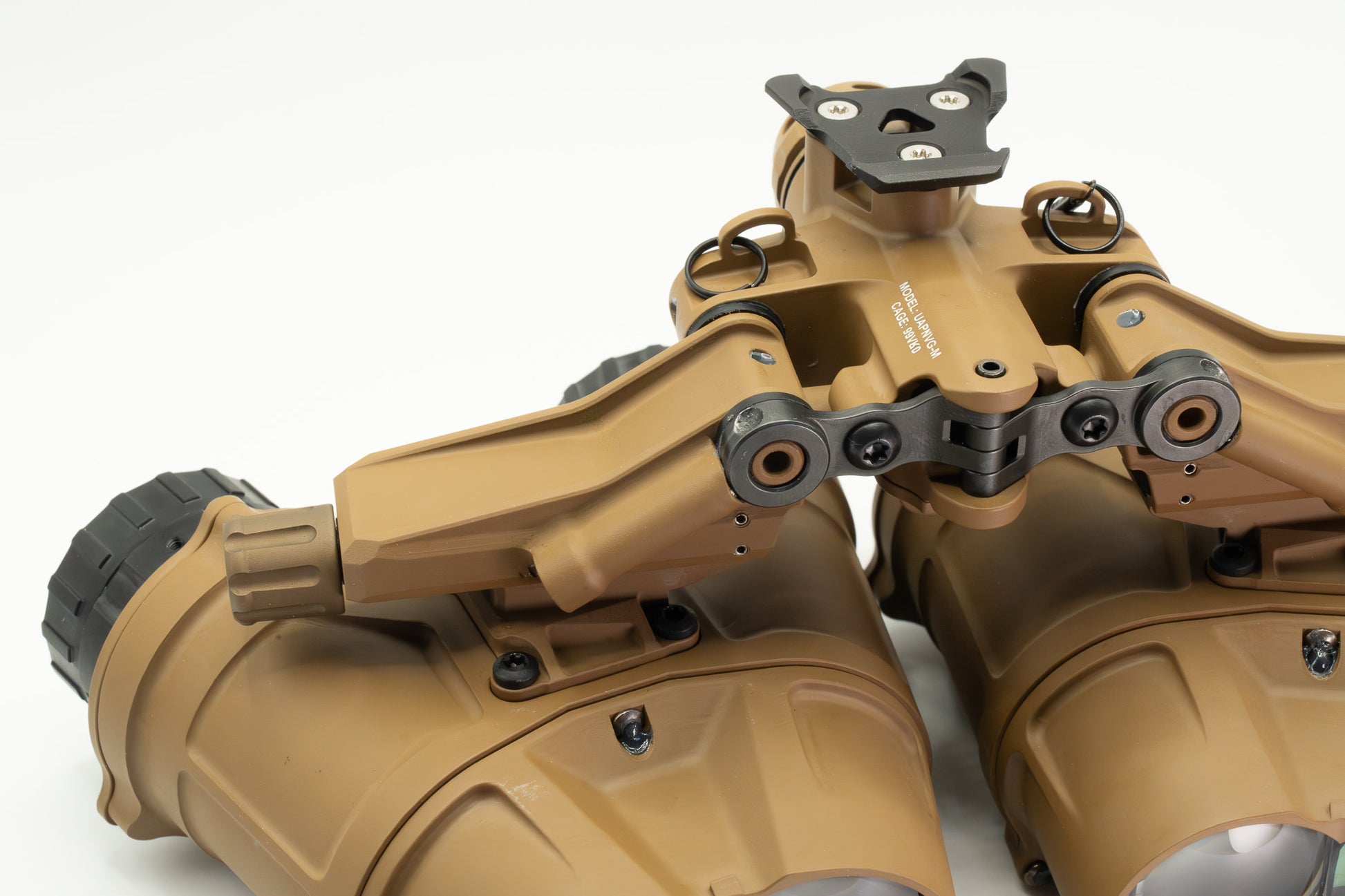 The Ultralight Articulating Panoramic Night Vision Goggle UAPNVG "Chimera" is the next evolution in panoramic nvg systems being the first articulating quad tube device. This patent pending system enables the lowest possible profile by stowing the pods back to the helmet to a profile typical of articulating binos reducing neck fatigue by pulling the center of gravity significantly closer to the natural pivot point of the neck. UAPNVG pods can be stowed individually without fully stowing the device which allows the user to clear door thresholds, increase head clearance in a vehicle, have rapid access to the night vision function, enter and exit vehicles much faster, reduced brush snag hazard, and use weapon mounted optics/thermal devices simultaneously with the goggle. In addition to the stand alone device is a bridge system that is plug and play at a user level with existing panoramic nvg pods offering compatibility with L3 GPNVG18, Lindu QTNVG, ANVIS10, Photonis PD Pro-Q, and more.