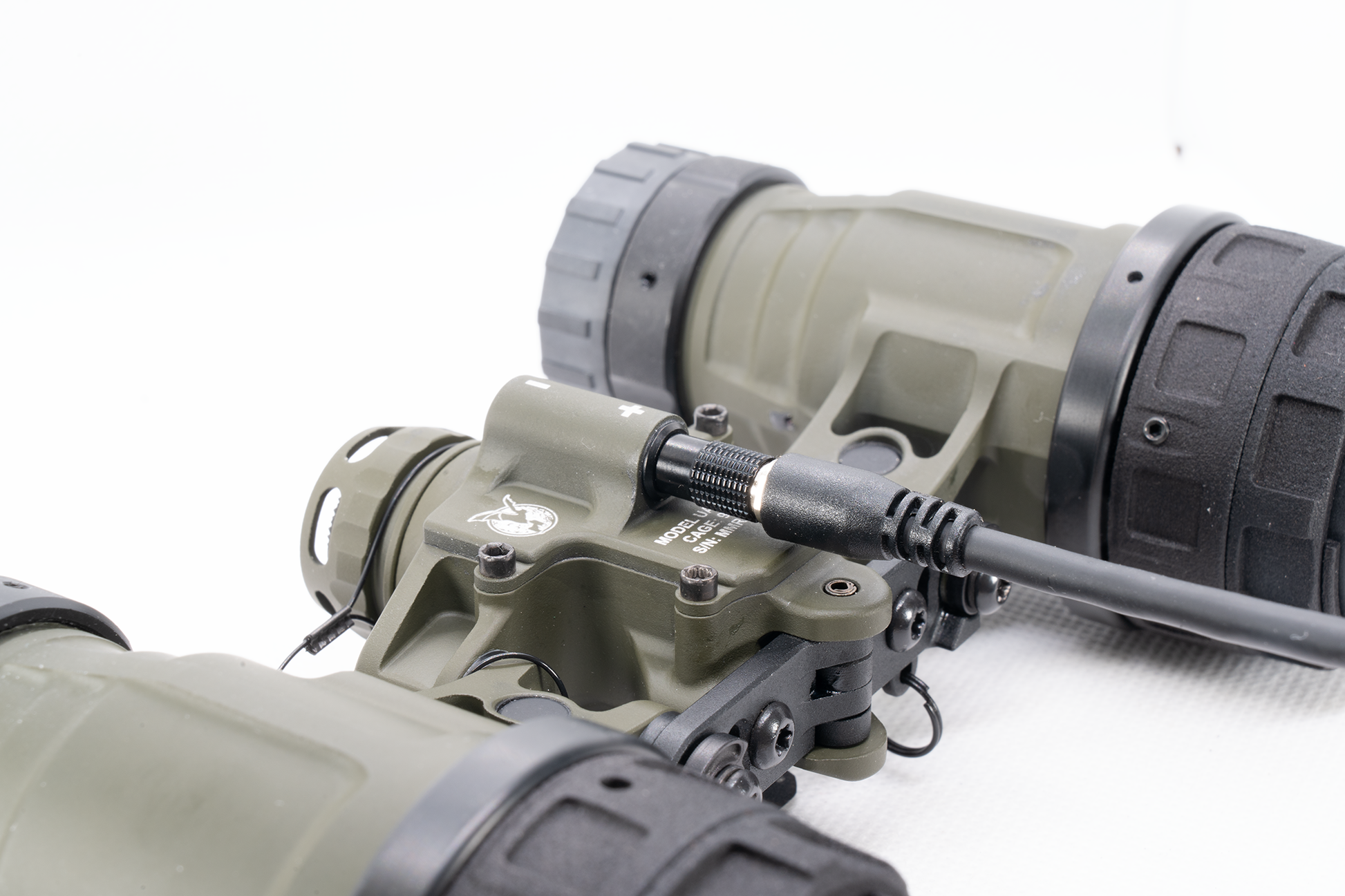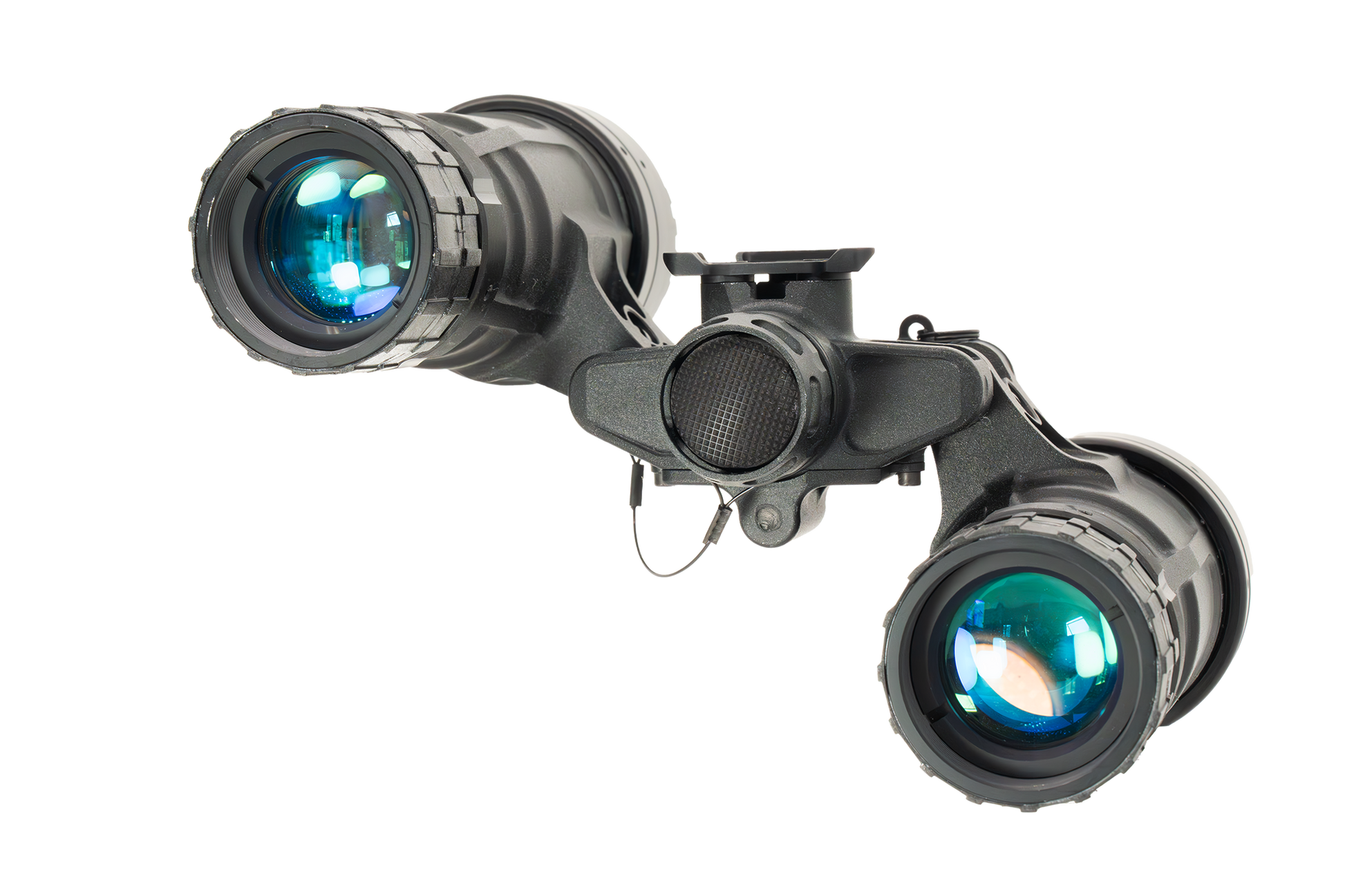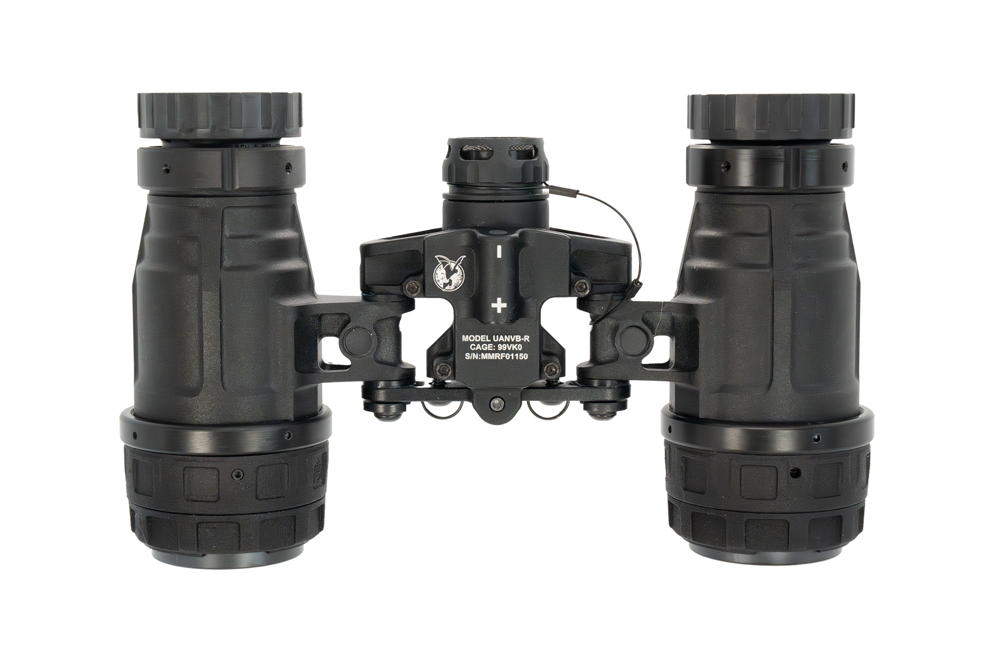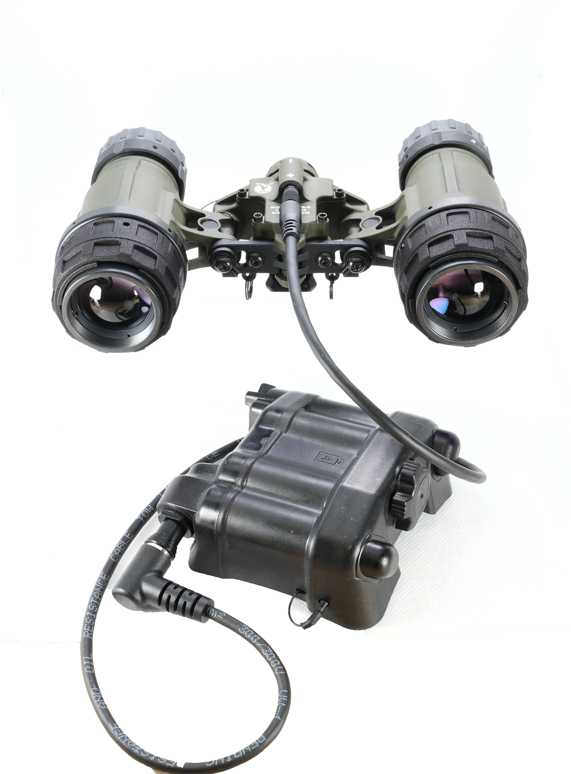 The Ultralight Articulating Night Vision Binocular - Katana Ruggedized (UANVB-R) “Katana Ruggadized” is a articulating binocular housing made of high strength aerospace grade 7075-T6 aluminum. Using advanced multi-axis CNC machining an ultra lightweight and robust design is achieved, including an optimal single piece pod geometry. This binocular includes features such as individual pod stow shutoff, IPD stops, user adjustable pod tension, and low battery indicator. The device is powered on-board by a single CR123A for a continuous runtime of ~25 hours, and equipped with a LEMO port for external power pack use to achieve extensive run time
