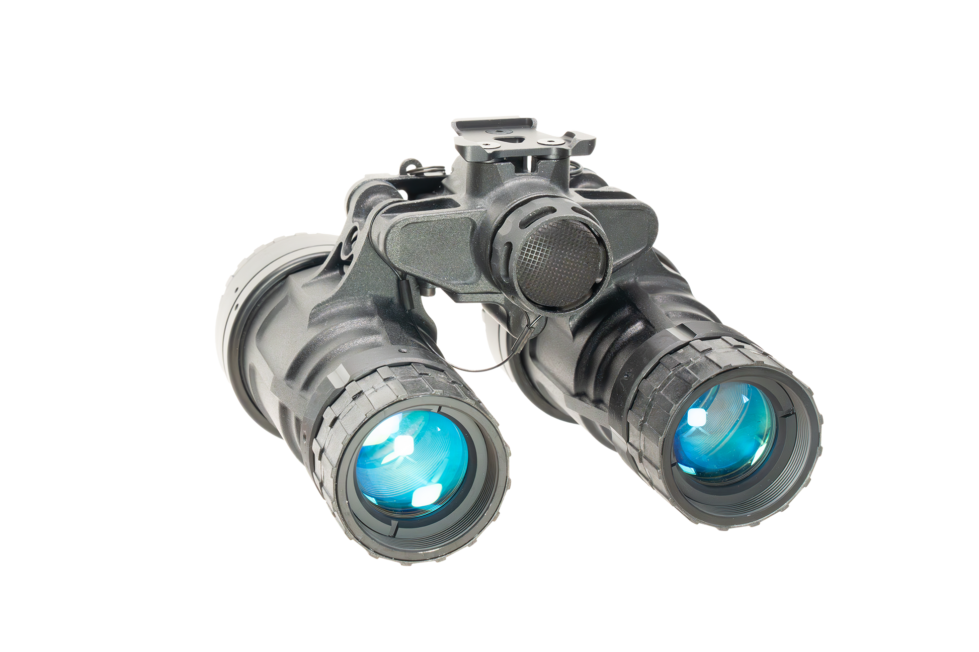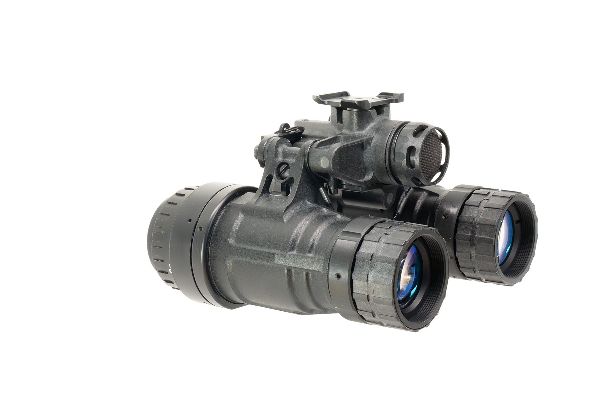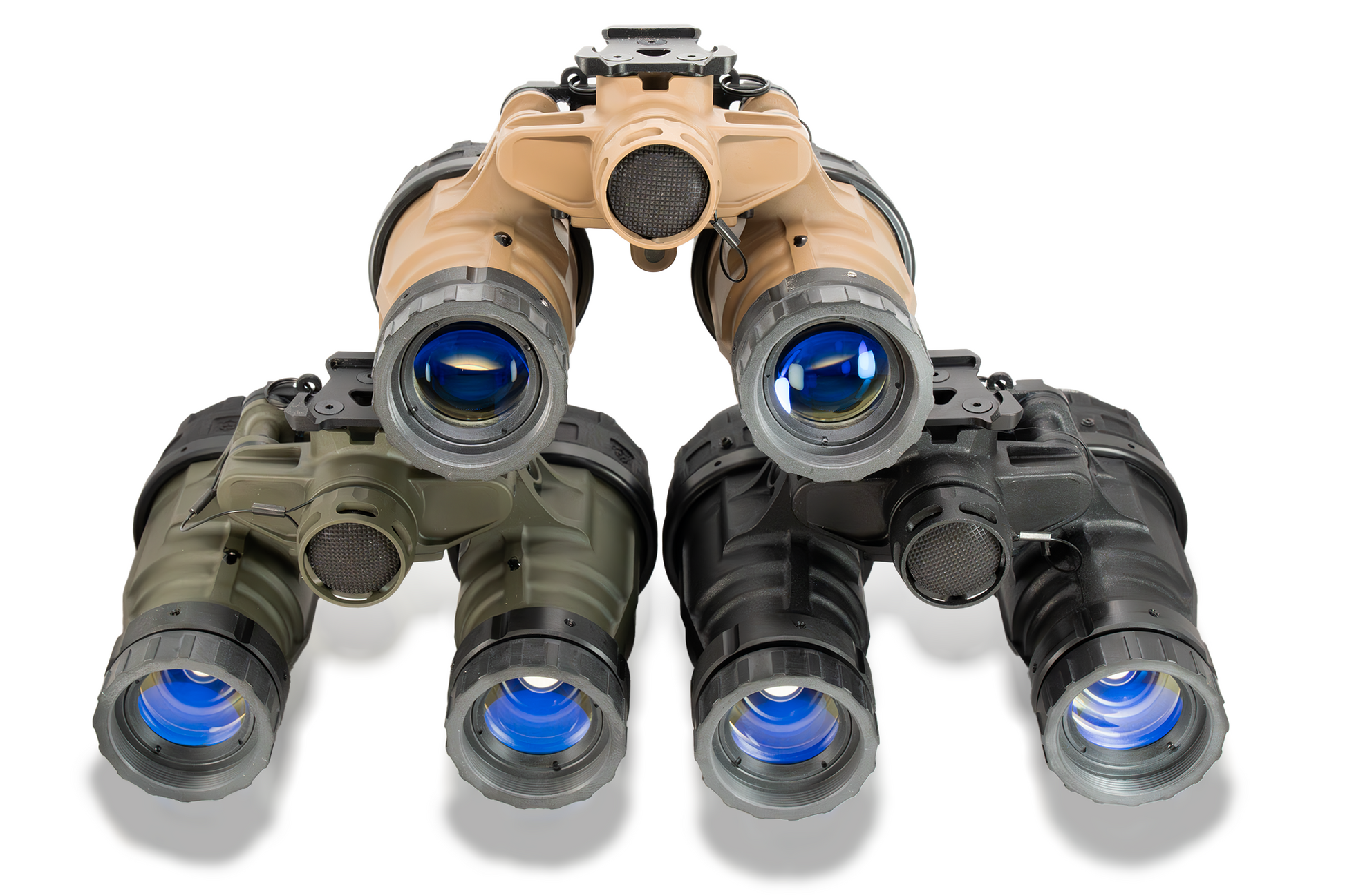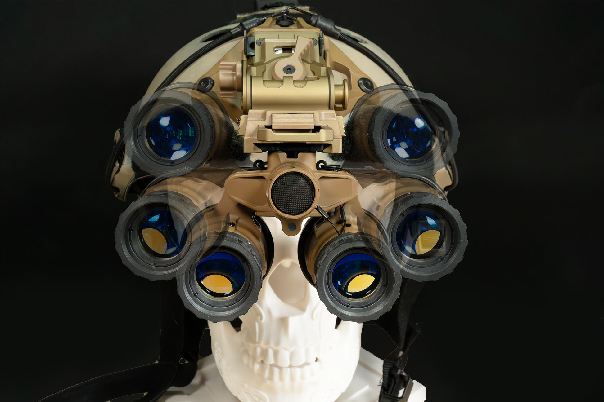 The Ultralight Articulating Night Vision Binocular - Katana Ruggedized (UANVB-R) “Katana Ruggadized” is a articulating binocular housing made of high strength aerospace grade 7075-T6 aluminum. Using advanced multi-axis CNC machining an ultra lightweight and robust design is achieved, including an optimal single piece pod geometry. This binocular includes features such as individual pod stow shutoff, IPD stops, user adjustable pod tension, and low battery indicator. The device is powered on-board by a single CR123A for a continuous runtime of ~25 hours, and equipped with a LEMO port for external power pack use to achieve extensive run time